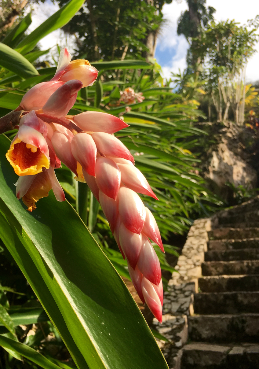 scaled by long tendrils of giant philodendron, and the enormous century old trees above smothered in bird nest fern and tillandsia. Flowering ginger