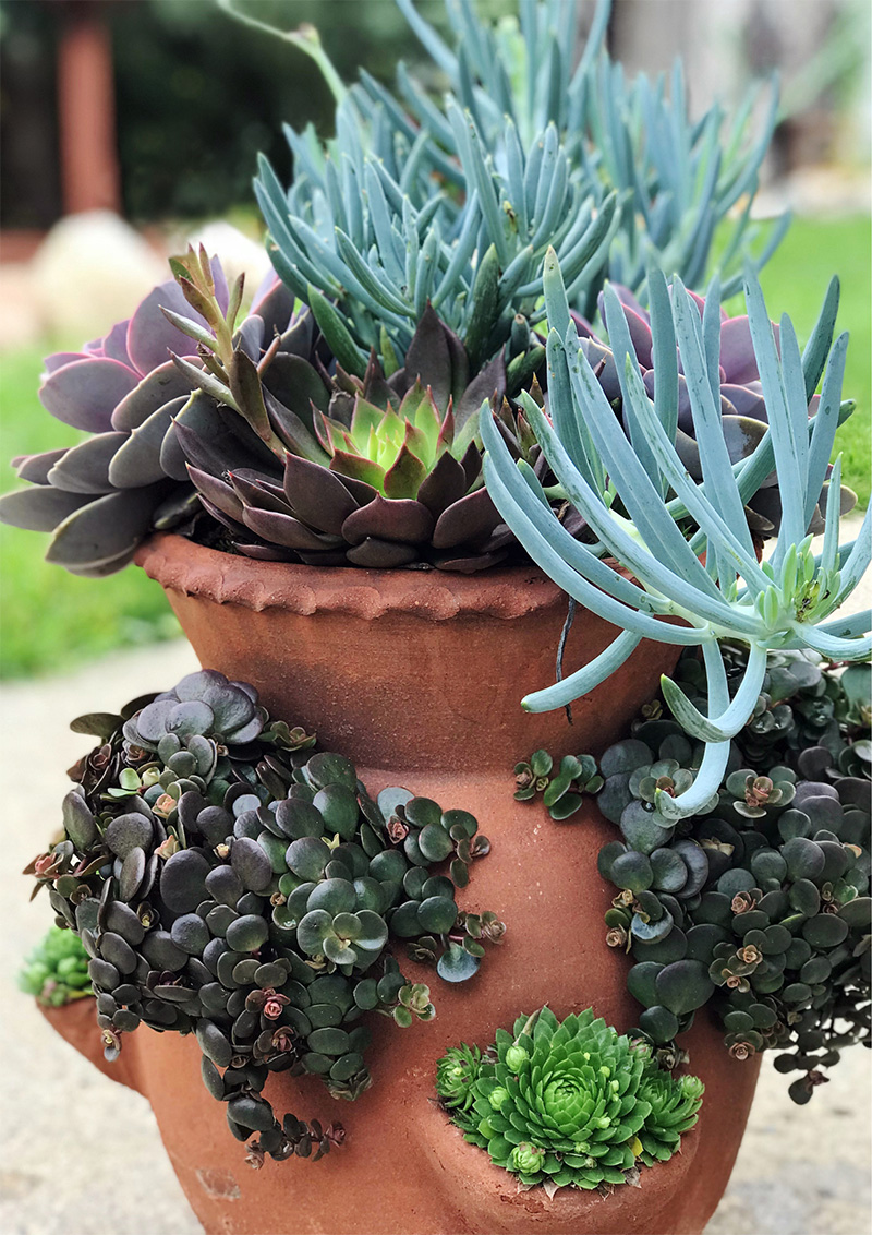 Succulents are hard- working plants but they demand so little. They make great pot candidates too. To recreate this look, fill a strawberry terracotta pot with cacti-and-succulent mix and plant with cuttings or mature plants of echeveria, blue chalk sticks (Curio repens), hens and chicks (Sempervivum tectorum) and Sedum 'Purple Blob'. Position in full sun and water in well.