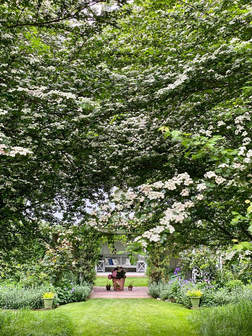 A path under the arching hawthorn leads to the visual full stop of a double summerhouse. Double? When Michael McCoy visited with a Ross Gardens Tour group