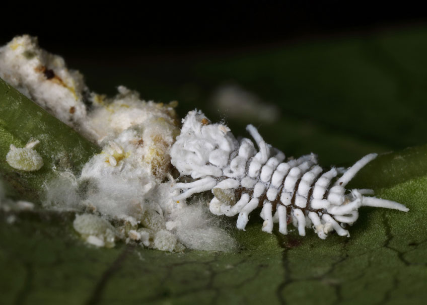 These pearly-white, fluffy little sap-suckers tend to attack plants under stress. Like aphids they secrete a honey-dew that black sooty mold grows on.