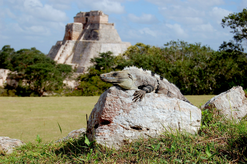 The ancient Mayan temple of Uxmal (Oosh-maal), and a member of the security team standing guard.