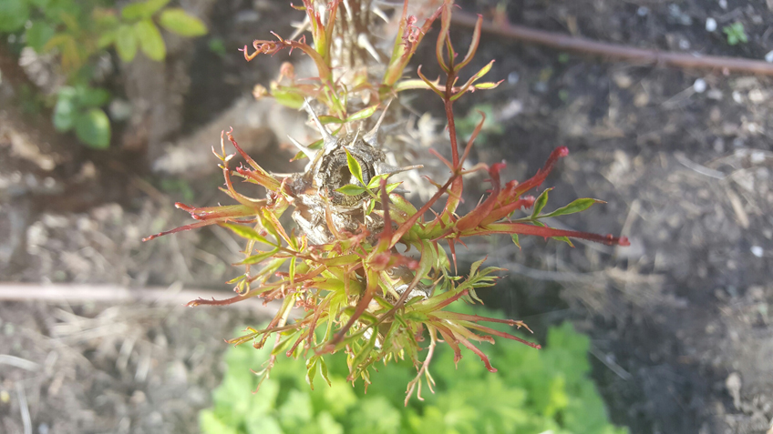 Glyphosate affected rose foliage. A sign the herbicide has either over-sprayed onto, or seeped into this rose.