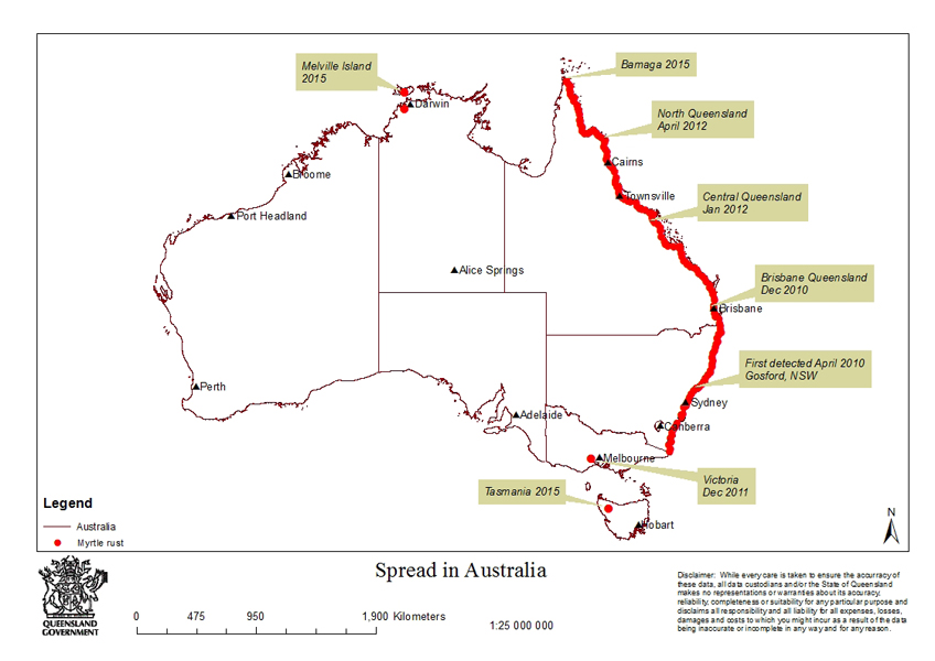 In 2010, myrtle rust was detected for the first time in Australia on the central coast of New South Wales. With the wind-borne nature of the disease and
