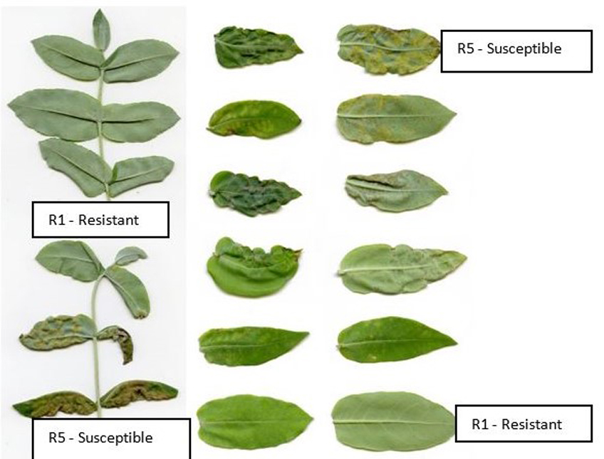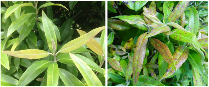 Lemon myrtle - uninfected leaves (left) and infected with myrtle rust (right). Photo - PBCRC
