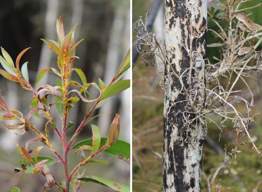 Early symptoms of myrtle rust infection on young Melaleuca quinquenervia (left) and causing death of M. quinquenervia coppice regeneration (right). Photo - PBCRC