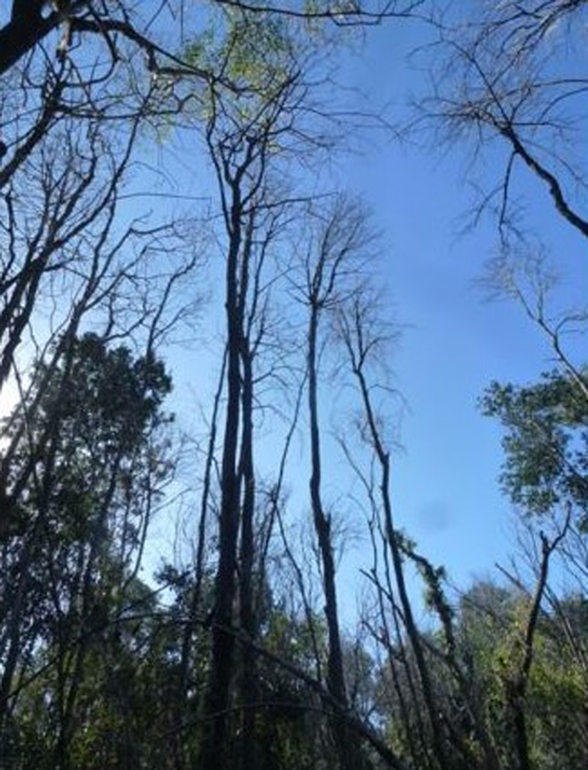 Death of mature native guava (Rhodomyrtus psidioides) in northern NSW as a result of repeated foliage dieback caused by myrtle rust. Photo - P. Entwistle