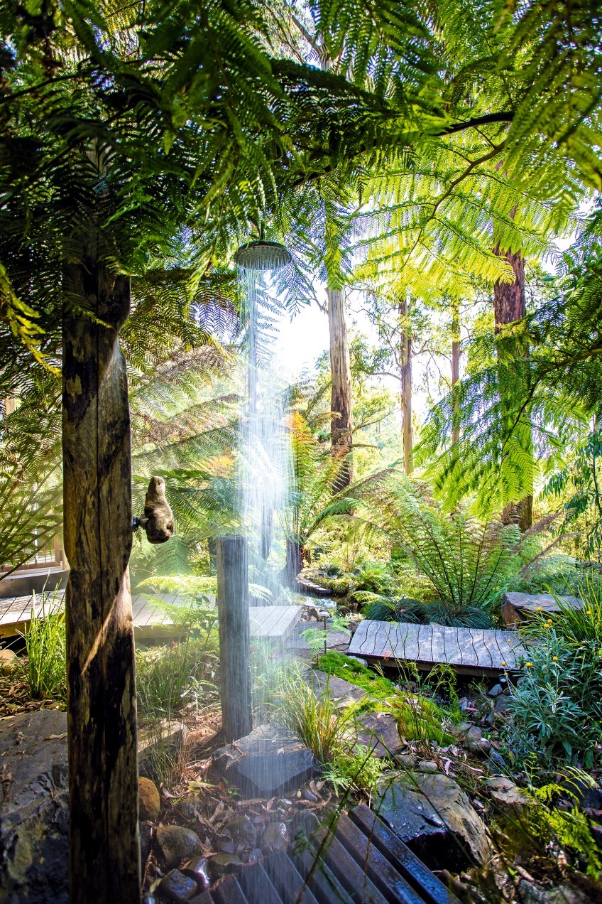 An outdoor shower is screened by tree fern fronds. Amazing pathways. Photo - Claire Takacs