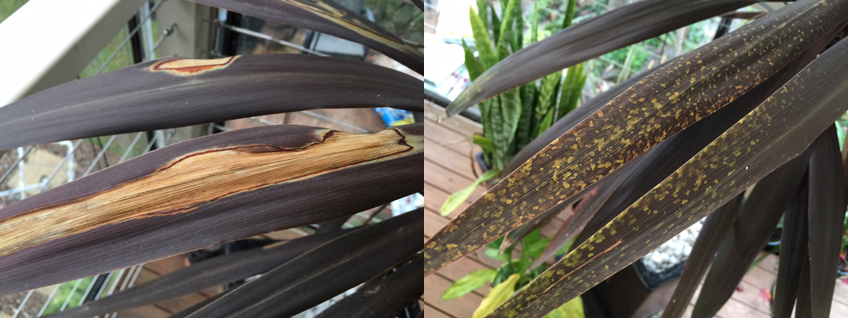 Left; This is sunburn, avoid watering leaves in pots where the foliage is exposed to direct sunlight. Right; Leaf spot can be fungal disease or occasionally bacteria
