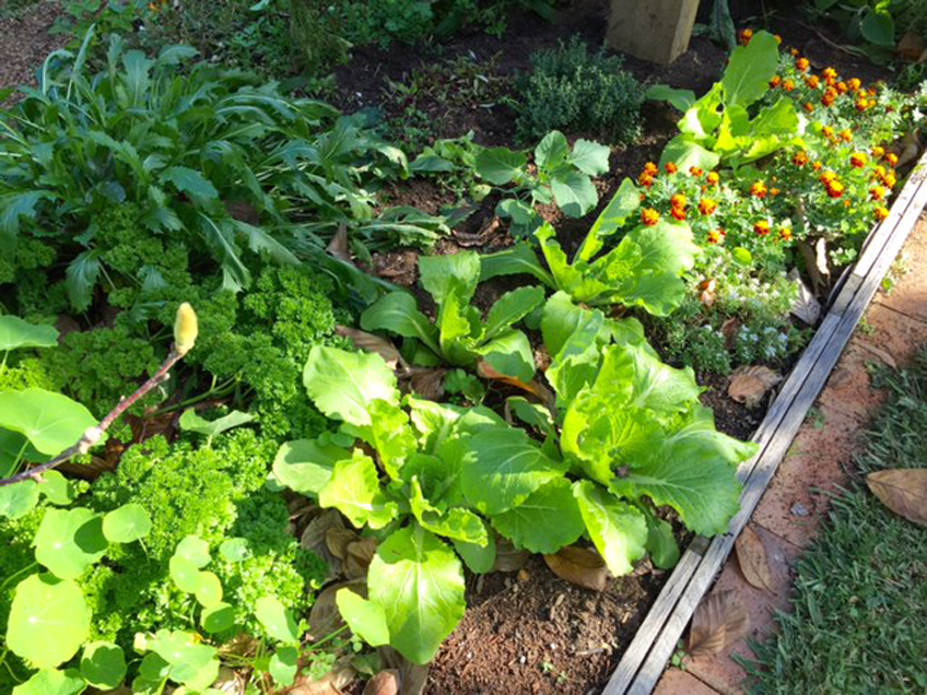 They’ve added flowering marigolds, nasturtiums and Sweet Alice (Alyssum). Colour, produce and no pests.