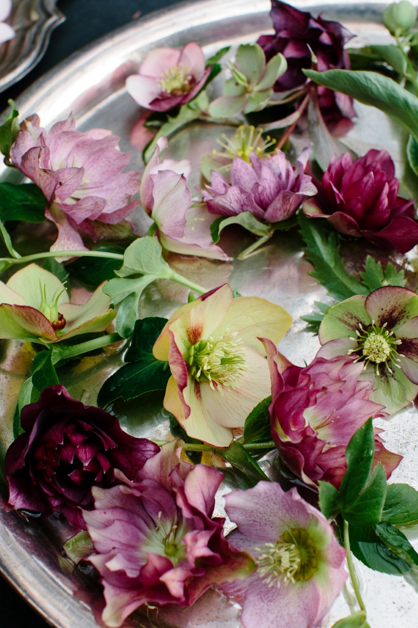 Pick winter rose (hellebore) flowers for float bowls so you can appreciate their shy spotted faces.