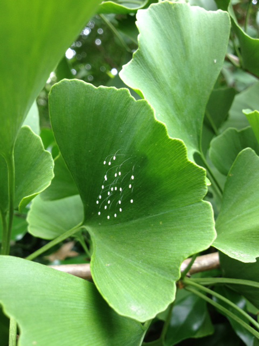Lacewing eggs on a gingko leaf. Photo – Graham Ross