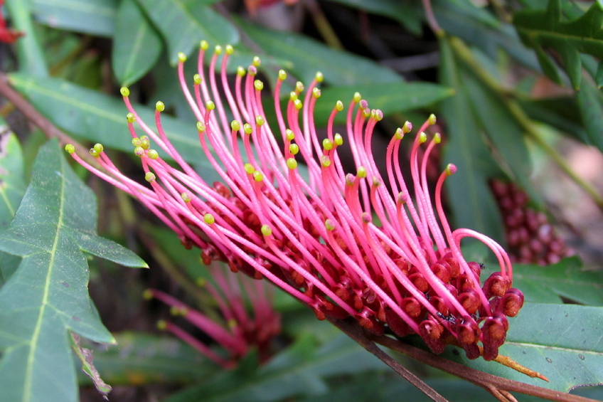 Leaves are dark green and variable with new growth purpley-red with deep red one-sided toothbrush flowers from late winter to November.