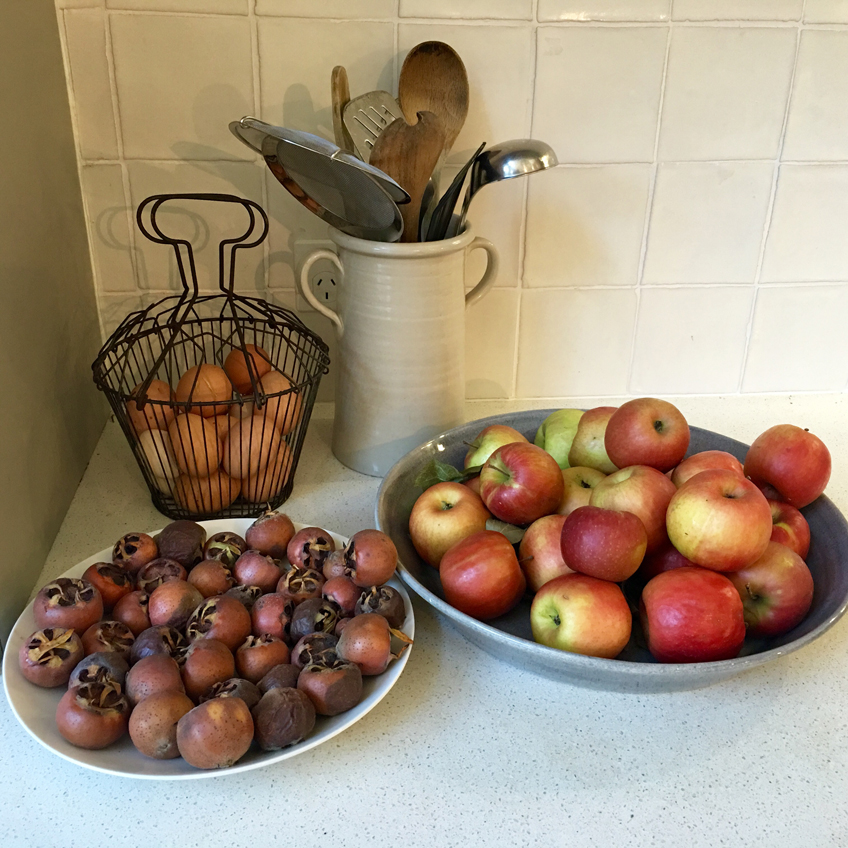 Here are some of the pink lady apples my daughter, Melaleuca picked for me. I used them to make Nigella Lawson's apple chutney. The fruit on the left are called medlars. Photo - Linda Ross
