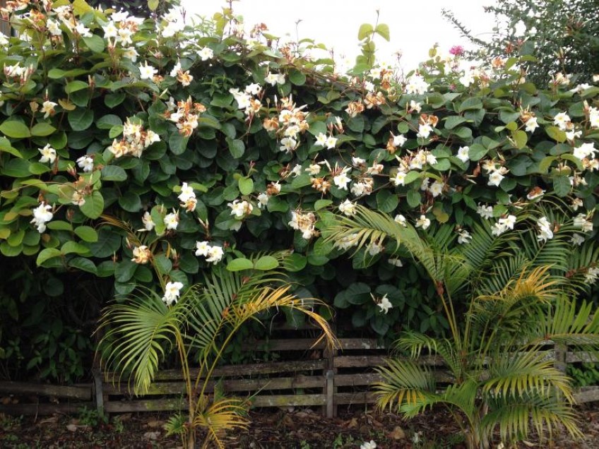 The Frangipani Vine is not actually a frangipani (Plumeria acutifolia), but it is a beautiful vine with large, white, powerfully fragrant