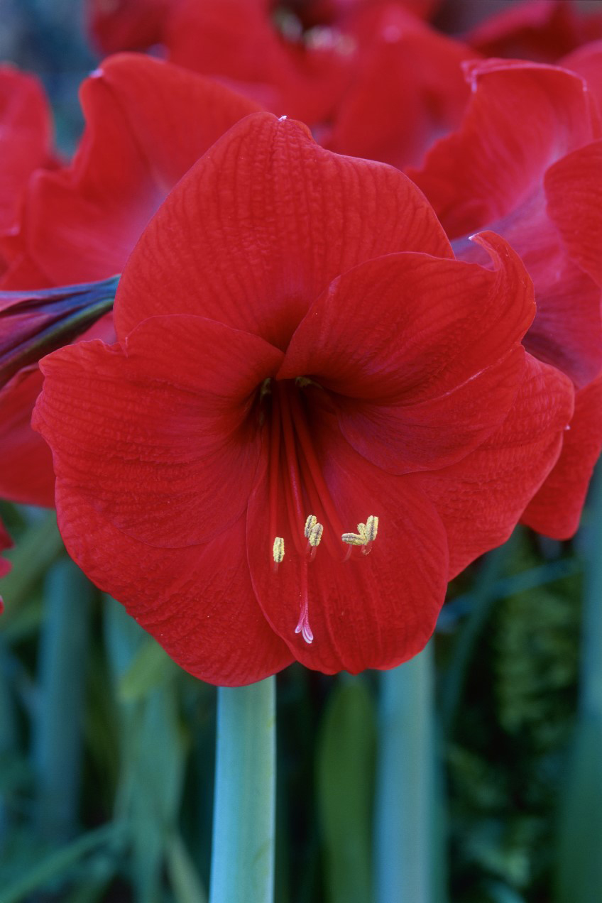 and green stripes. And Hippeastrum amarylis, with it's classic red flower. Happy in pots or in the garden.