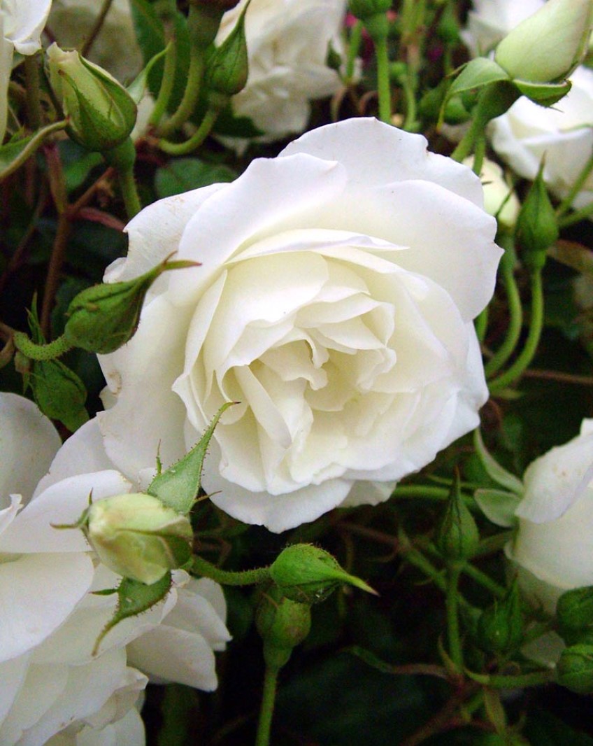 ‘Iceberg’ (Cluster): the most popular rose due to its vigorous growth and prolific flowering. Cream to white flowers appear in large clusters