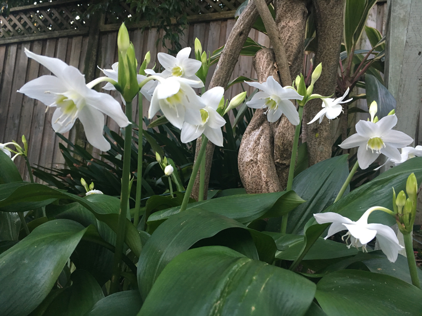 They are borne in clusters of 3-6 blooms on a 40cm stalk. The Eucharist lily is a tropical plant enjoying moist-warm conditions. It does not like cold