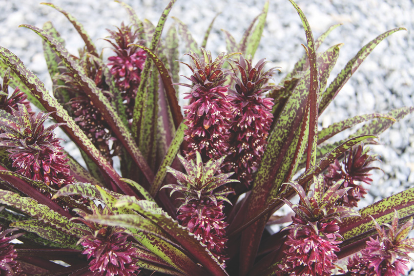pot with rich burgundy coloured leaves and then a thick stem produces a spike of pineapple-like flowers with tiny starry purple flowers that last eight