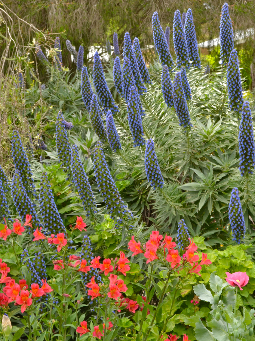 This tall wide shrub has spectacular, long purple spires filled with thousands of individual Patterson-curse-like flowers from spring into summer. It stands