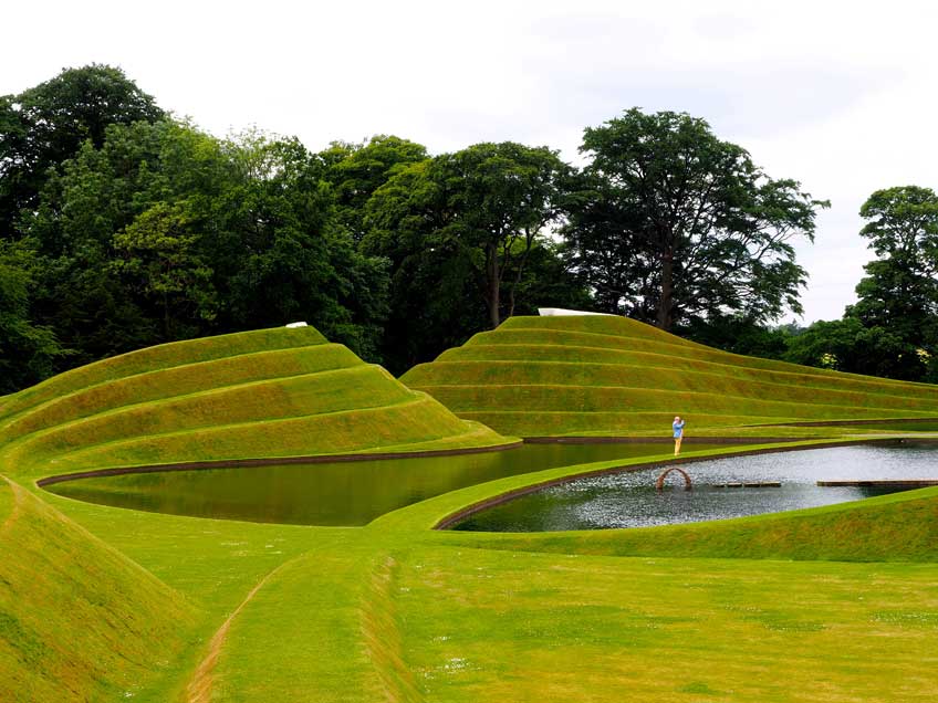 of perfectly turfed hillocks and curving reflective pools that makes you impatient to explore it on foot. The land forms are based on human cells,