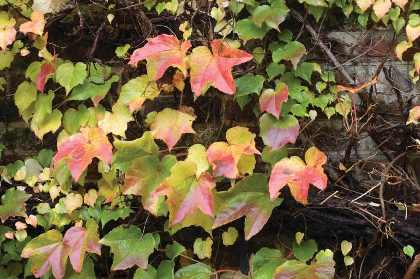 to red in autumn. It has greenish flowers that turn into blue berries that ripen to red. One for large walls.