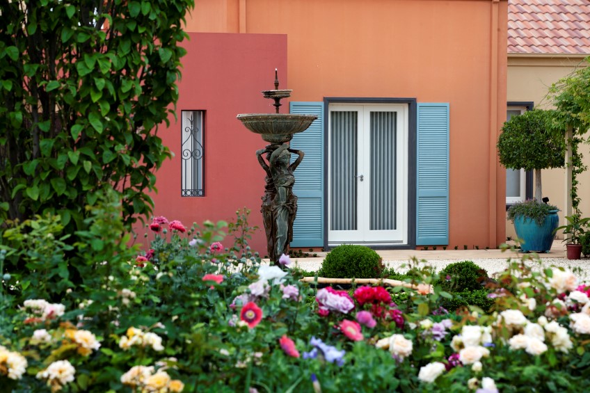 provide dense shade in the hot, dry summers, flamboyant flower borders and a formal rose garden, all designed around a Mediterranean-style house on