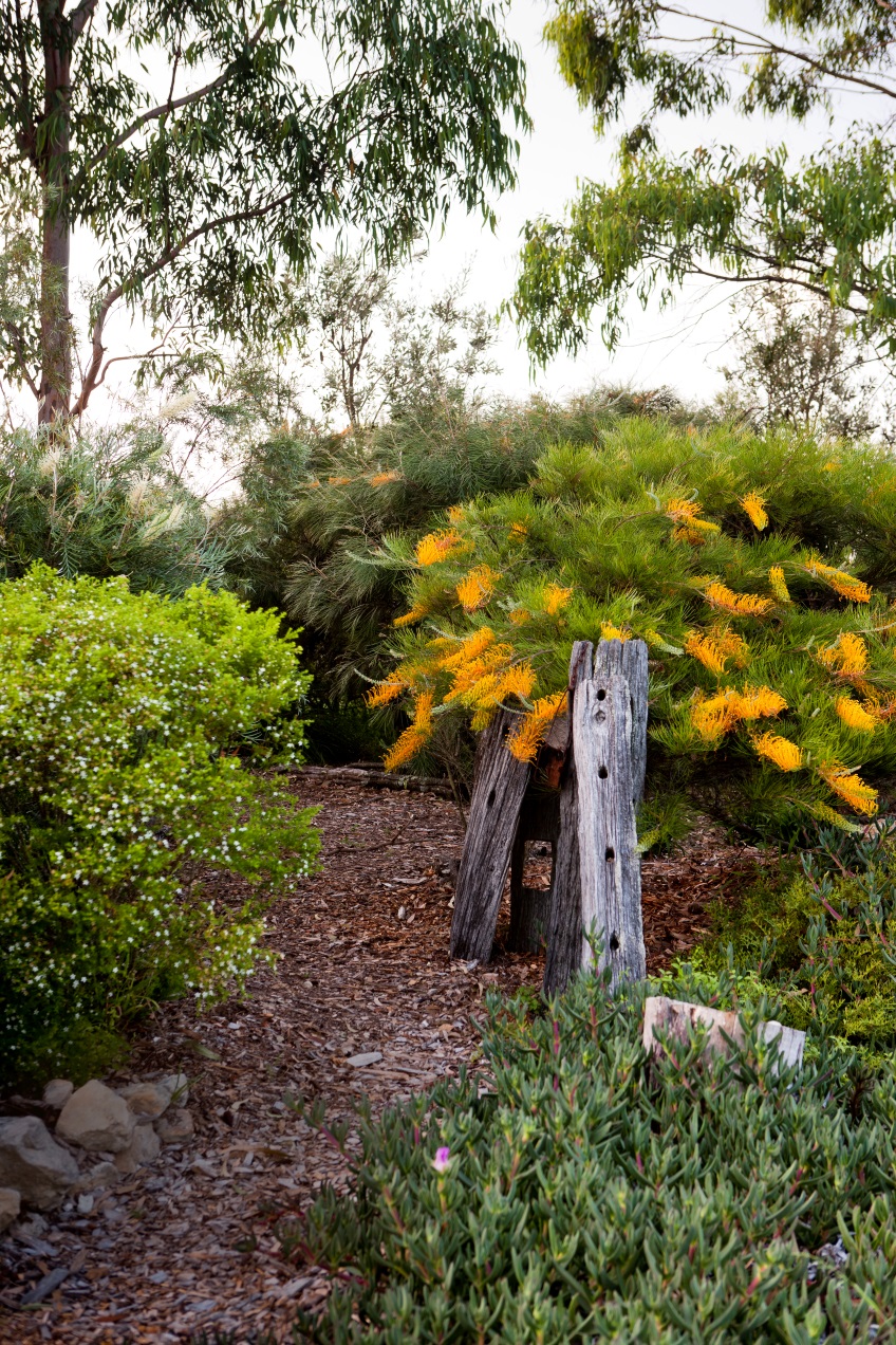 Sweeping beds are mounded high with imported soil for maximum drainage, and feature plenty of grevilleas and bottlebrush. Pretty perennials edge the beds