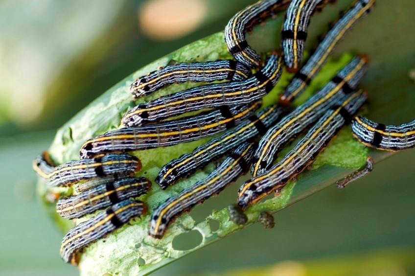 leaf, and the growing caterpillars then work their way down to the base of the plant. Remove the baby caterpillars before they spread or spray plants