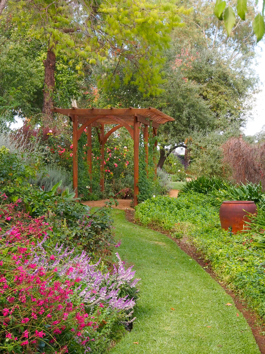We saw Anne Ward’s garden Gayton, above, on our Tastings: Orange tour last autumn. I loved this pergola, with its subtle arches and curves echoing