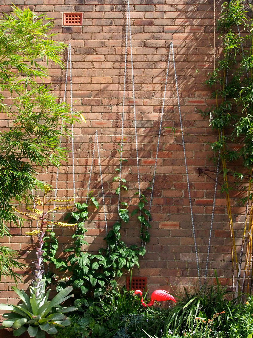 Above: Brendan Moar used a zigzag of silver chain as the support for a climber on the tall adjoining wall of a small garden. Below: Another