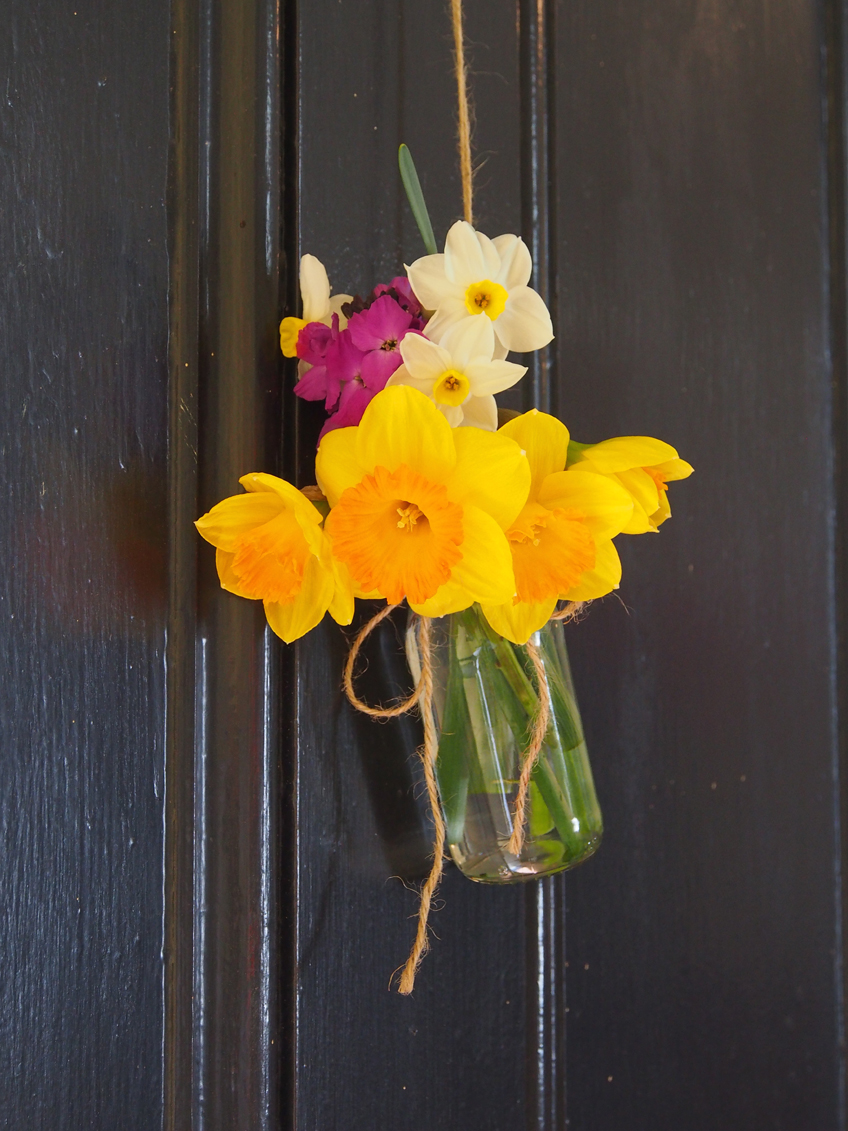 When there’s no room for a pot, how about a jar of flowers, hung by string from a hook on the door.