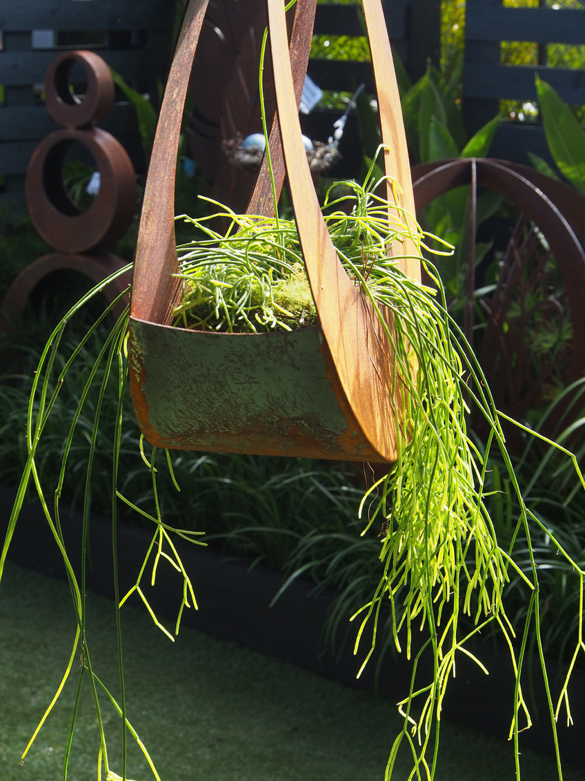 Seen at Queensland Garden Expo, Nambour this teardrop corten hanging container from Broadcroft Design with a cascade of rhipsalis is modernity itself;