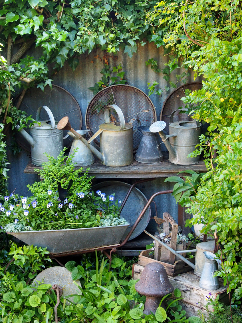Also for show is this fabulous collection of gal iron watering cans, framed by a wreath of leaves and barrow load of hearts-ease.