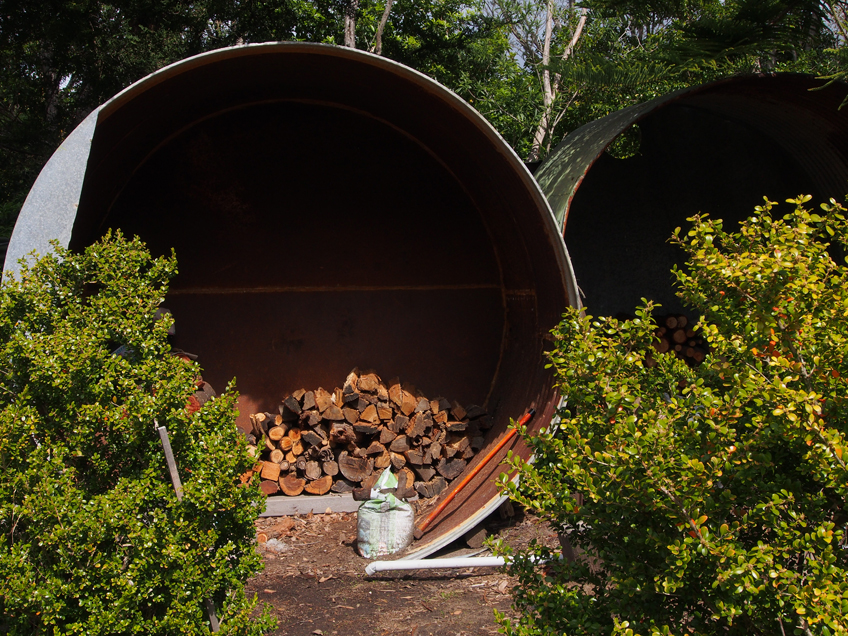 wood solution, this time an old water tank repurposed as a wood shed, at Petana.