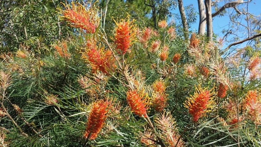 ‘Honey Barbara’ has glowing orange flower heads and relatively compact growth (approximately three metres tall by two metres wide). It thrives in a well-drained