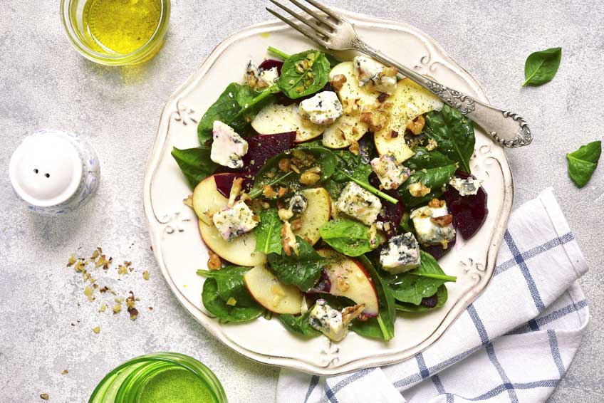 3. Toss apples, spinach leaves, beetroot and nuts with some of the dressing.