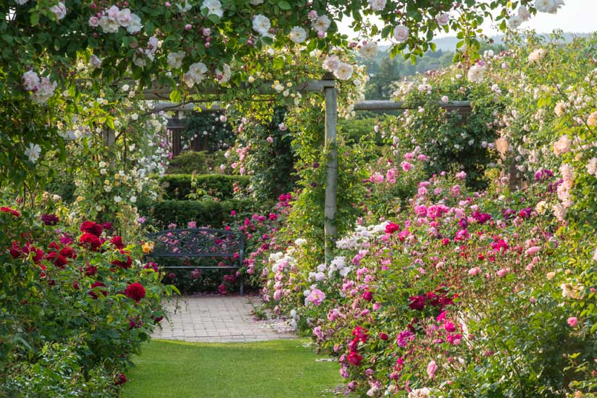 Roses bloom in the borders, climb over pergolas and arches, spiral up pillars and lounge along swags in The Garden at Broughton Hall at Jindivick, in the