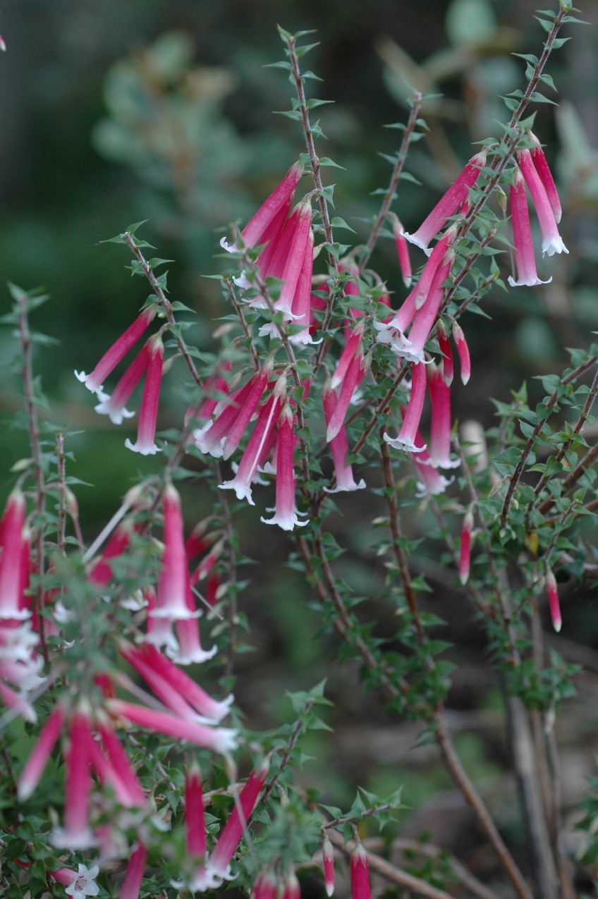 Native Fuchsia is a fairly straggly looking shrub, growing to the modest height of 1m. Its small, hard, pointy leaves run up and down the stems, similar