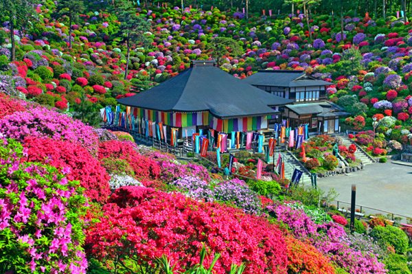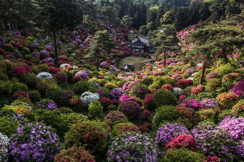 Forty minutes north-west of Tokyo the 1300-year old Shiofune Kannon Temple sits in a secluded valley planted with 17,000 perfectly clipped azaleas. Every May the valley shimmers with iridescent colour as the azaleas bloom. Visitors can walk the zig-zagged pathways through the luminous maze of colour to the giant statue of Buddha on the hill for an incredible bird’s eye view down the valley.