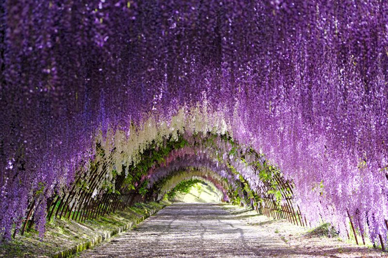 The wisteria arches of Kawachi Fuji Garden draw millions of Japanese tourists for five days in May. They make the seven-hour journey from Tokyo to walk under the 200m-long arches, which are planted with 20 different varieties of Japanese wisteria - palest lilac, white, pink to deepest purple - that dangle and dance, offering up-close enjoyment of the blooms and their intense fragrance.