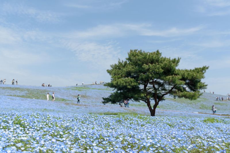 In May at the Hitachi Seaside Park the curving pathway to a brilliant view of the Pacific Ocean leads up a hill turned palest blue, courtesy of four million Baby Blue Eyes, or Nemophila. Almost as good as the flowers - the locals bringing their dogs in prams for photo opportunities!