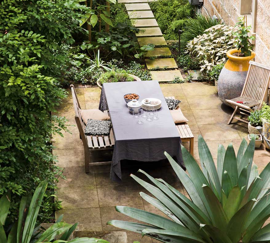 The outdoor dining terrace gets its snug room-like feel thanks to a raised sandstone planter and stair at one end, and a perfectly placed remnant angel’s