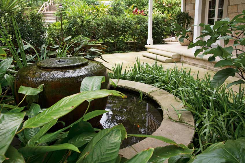 coping to enhance the timeless character. Plants keep the pond fit and healthy, soaking up the nutrients and providing a hiding place for fish when