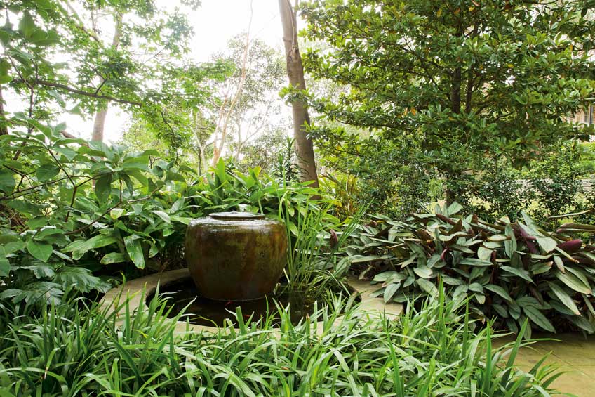 Movement is injected into the garden by a circular pond with an overflowing urn. It’s always been there – I just upgraded it and added a curved sandstone
