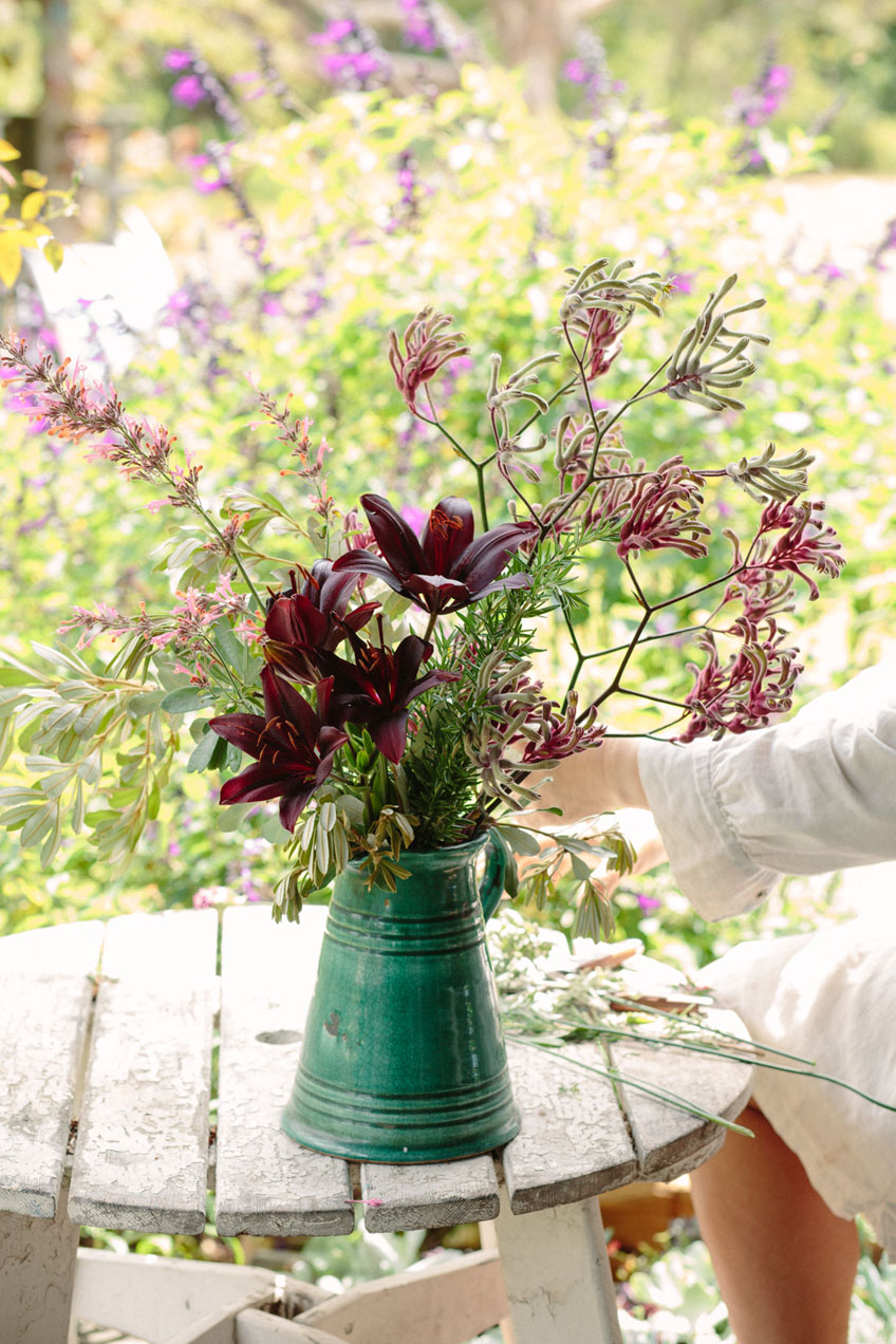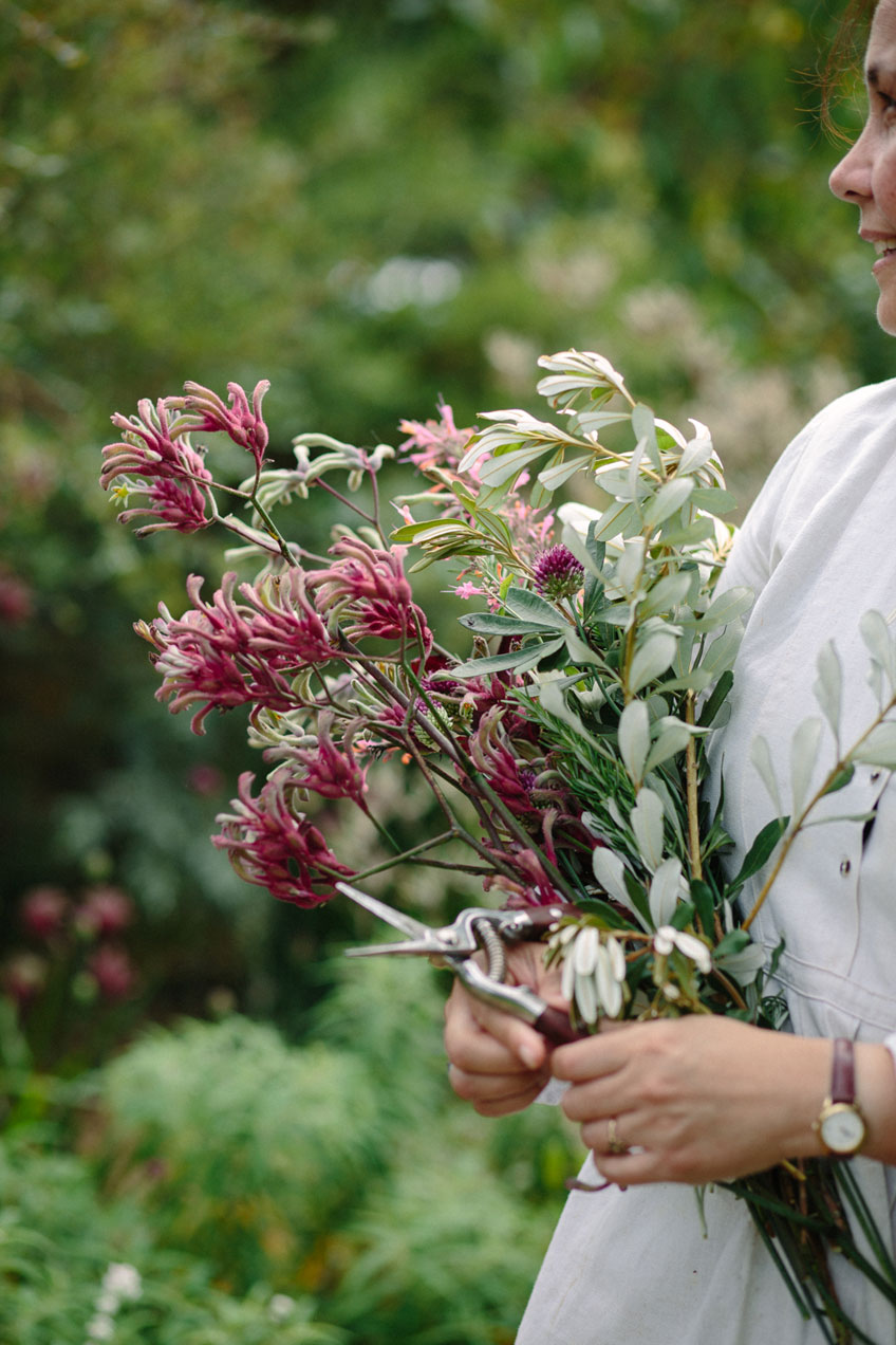 colour palette and not go overboard by picking too many different things. Three to five floral ingredients will do it she said, picking lilies, kangaroo