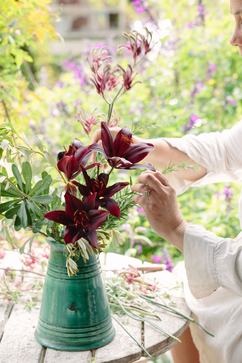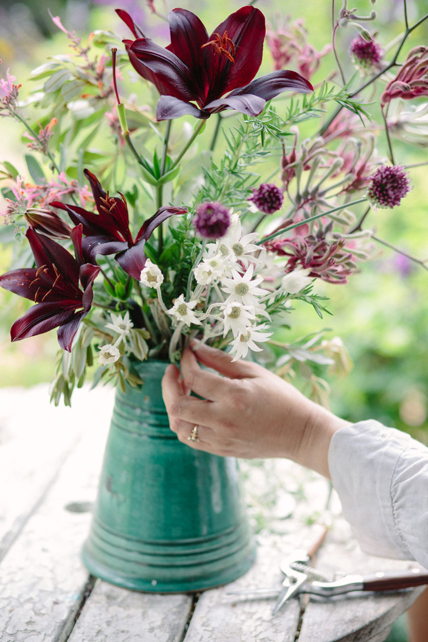 Next add the focal points of your arrangement - the big showy flowers. These might be large rose, or dahlias, or in this case, my lovely ‘black’ lilies.These