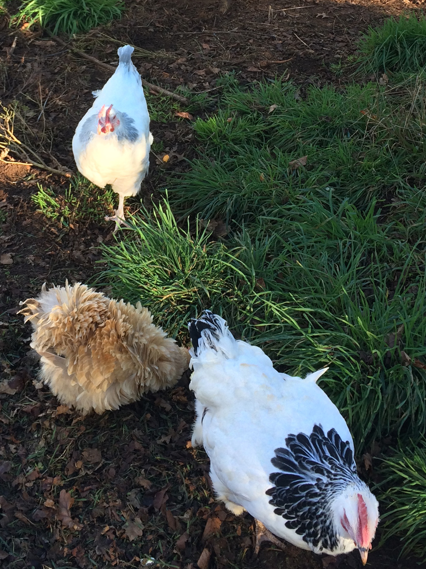 White Sussex in the foreground with a light brown Silkie behind.