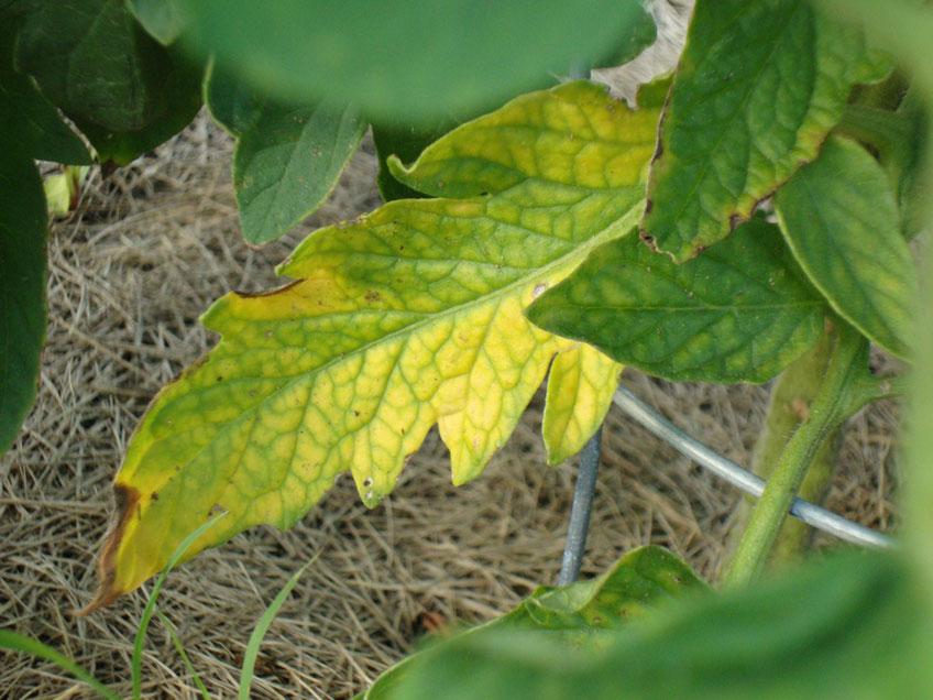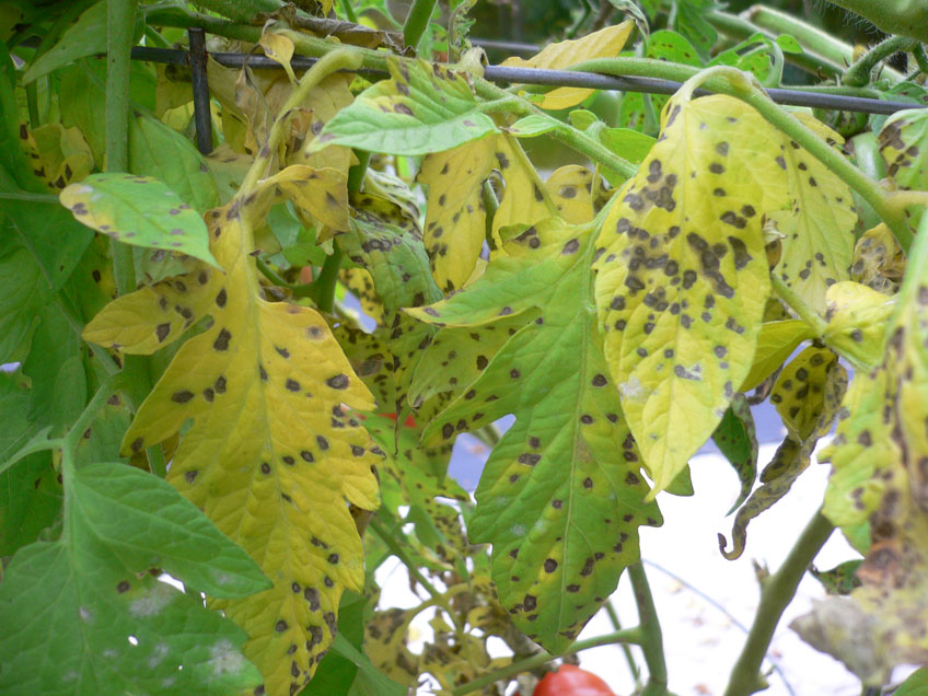 6. Dark, concentrically ringed spots that cover the lower leaves and stems are an early sign of blight. Prevent and control its spread by spraying with Eco Fungicde. Limit the spread of the disease by not getting water on the leaves when watering and not handling plants when they are wet.