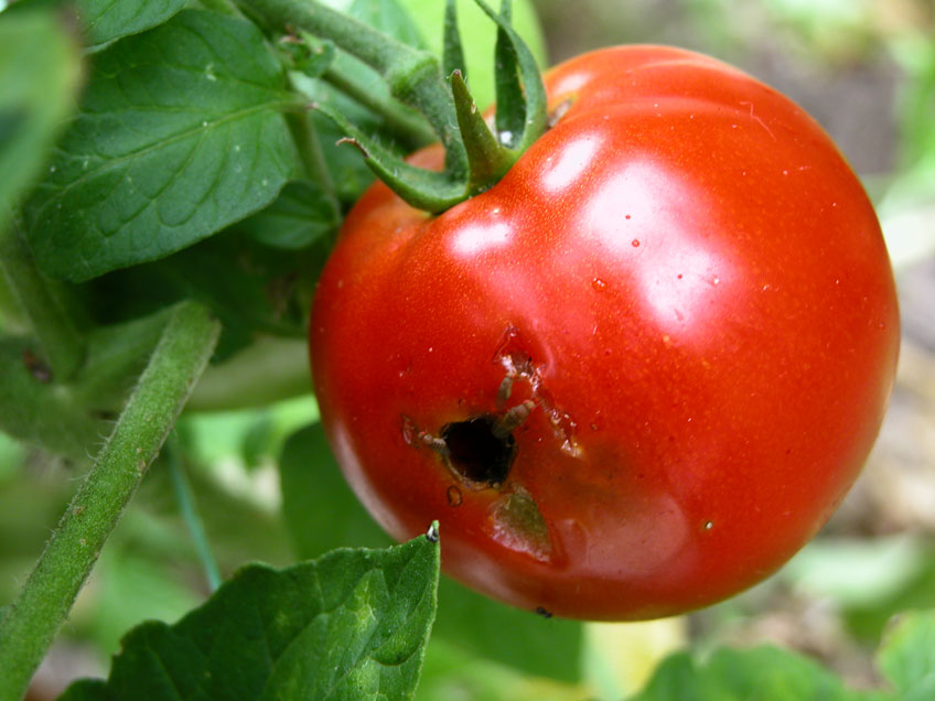 9. Holes chewed in tomatoes can be the work of slugs. There is nothing worse than picking a tomato and finding a slug happily working its way through it. Slugs can be thwarted with iron phosphate-based slug pellets or a ring of crushed eggshells.