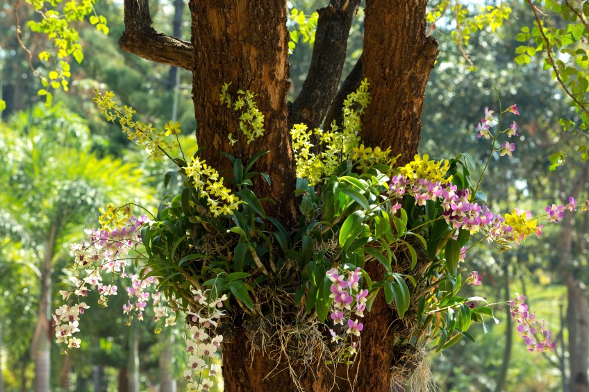 Many species of orchids will naturalise when mounted on trees, as they are epiphytic in the wild, meaning that they grow naturally without soil. Orchids